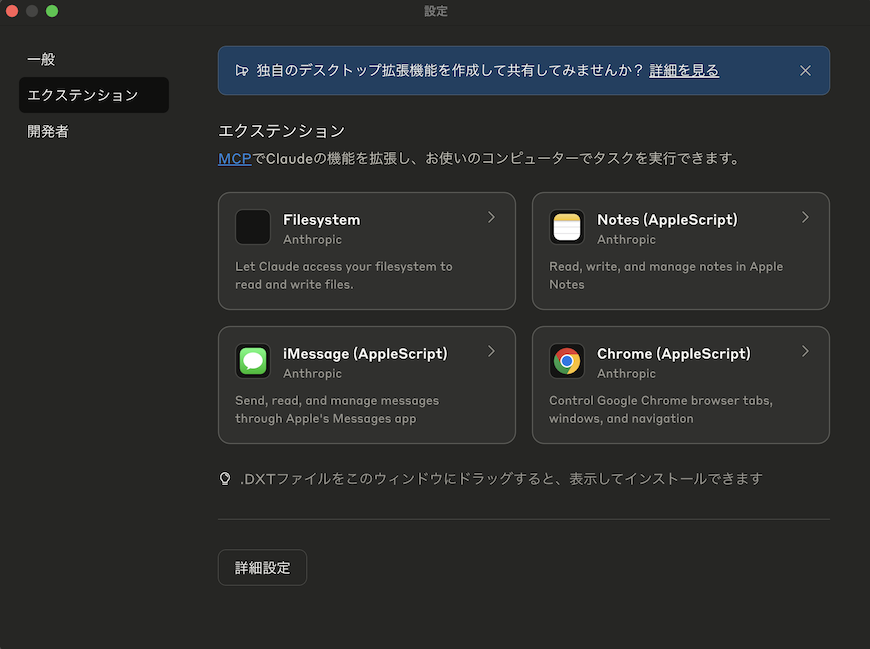 ローカルにMCPサーバをインストールするために必要な一式をまとめた.dxtファイルを作成し、それをClaudeDesktopにドロップする事でインストールが可能になります。