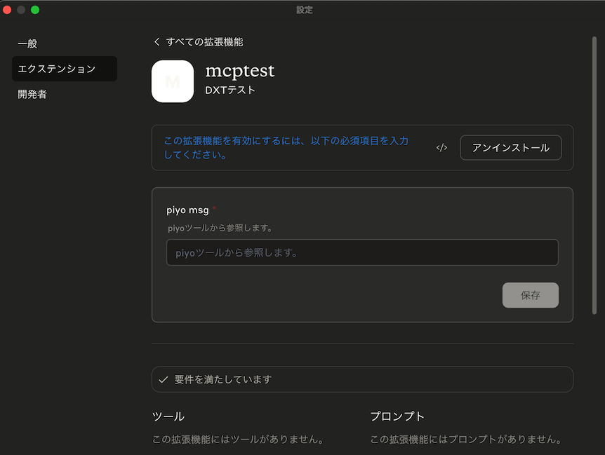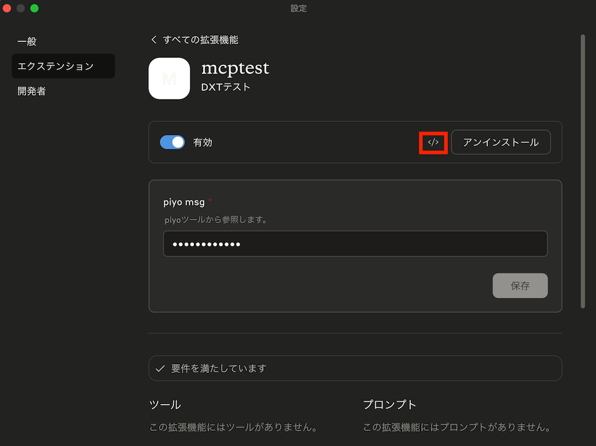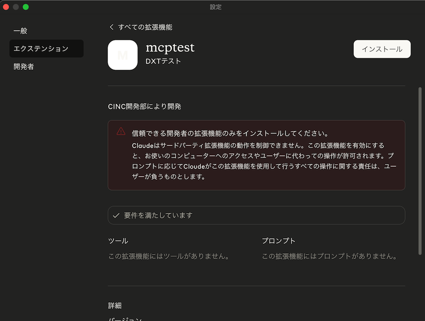 出来上がったtestmcp.dxtをClaudeDesktopにインストールします。