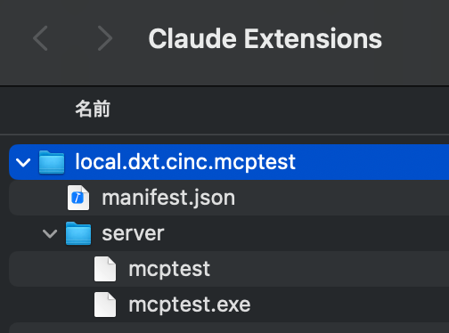 実行すると、同ディレクトリ内に testmcp.dxt というファイルが出来上がると思います。