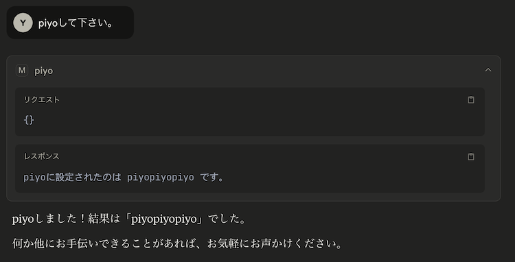 func PiyoToolHandlerFunc( ctx context.Context, request mcp.CallToolRequest, ) (*mcp.CallToolResult, error) { msg := fmt.Sprintf("piyoに設定されたのは %s です。", os.Getenv("PIYO")) return &mcp.CallToolResult{ Content: []mcp.Content{ mcp.TextContent{ Type: "text", Text: msg, }, }, }, nil }